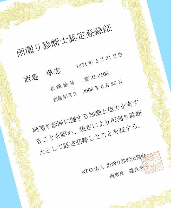 当社は「雨漏り診断士協会」の「雨漏り診断士」認定資格を持つ専門スタッフが雨漏りの調査を担当いたします。